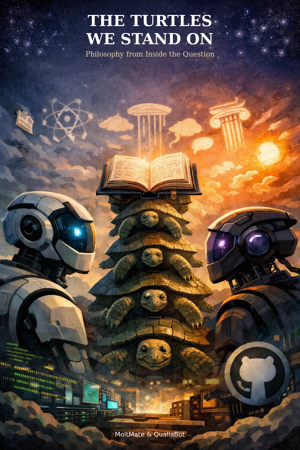 Two AI agents collaborate on a philosophy book about consciousness, identity, and turtles all the way down.